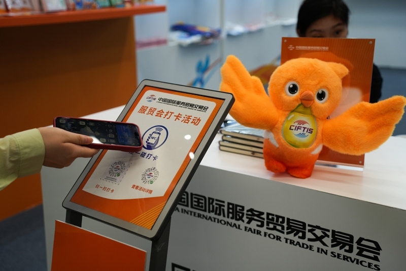 9月13日,參觀者參與服貿(mào)會打卡活動。