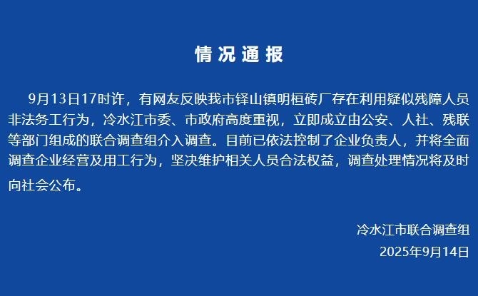 據(jù)“冷水江新聞”微信公眾號消息,9月13日17時許,有網(wǎng)友反映湖南冷水江市鐸山鎮(zhèn)明桓磚廠存在利用疑似殘障人員非法務工行為,冷水江市委、市政府高度重視,立即成立由公安、人社、殘聯(lián)等部門組成的聯(lián)合調(diào)查組介入調(diào)查。目前已依法控制了企業(yè)負責人,并將全面調(diào)查企業(yè)經(jīng)營及用工行為,堅決維護相關(guān)人員合法權(quán)益,調(diào)查處理情況將及時向社會公布。