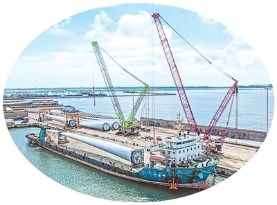 在山東省榮成市石島管理區(qū)的海上風(fēng)電產(chǎn)業(yè)基地,超大型風(fēng)電葉片正在吊裝和運輸,準(zhǔn)備運往海上作業(yè)區(qū)進行安裝。李信君攝(人民視覺)