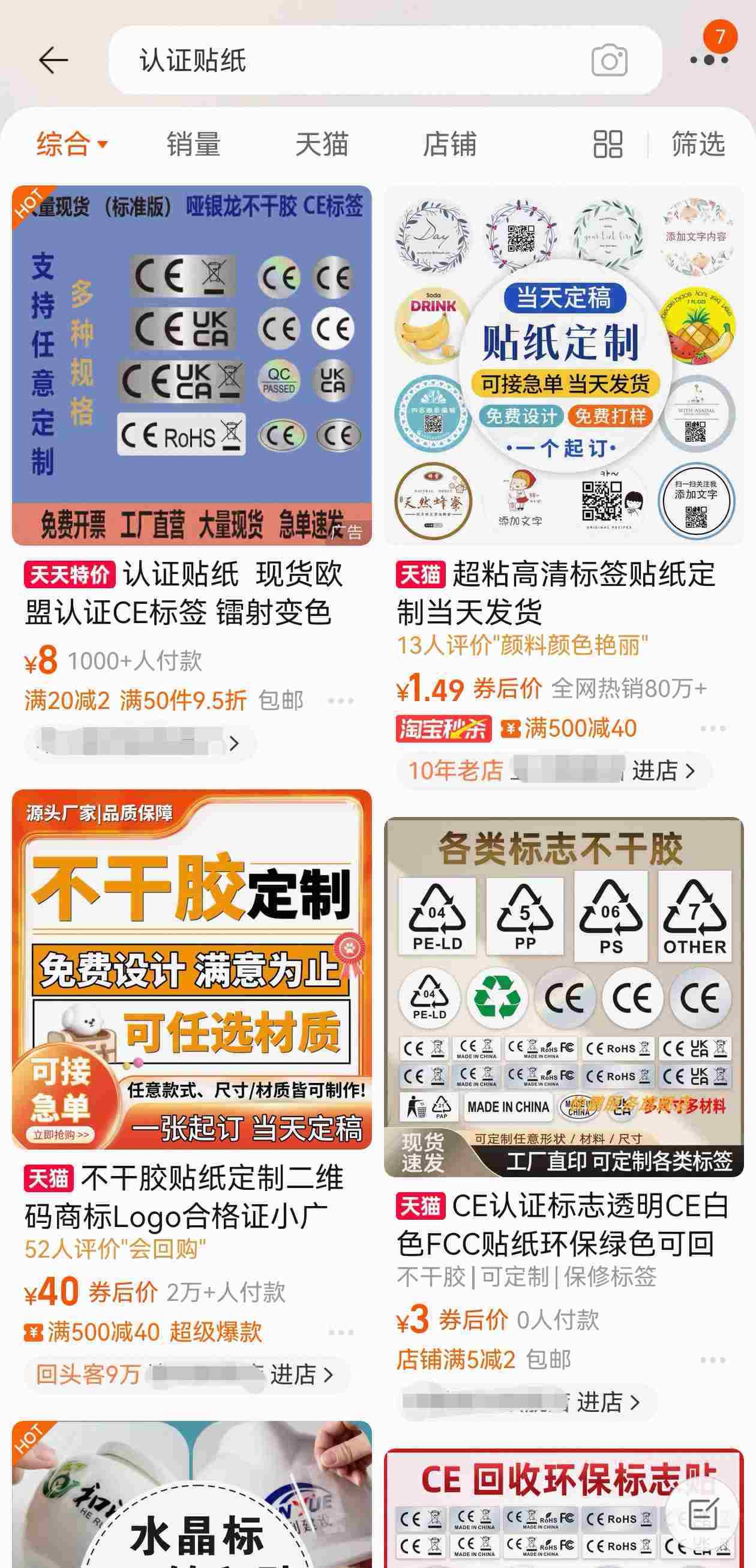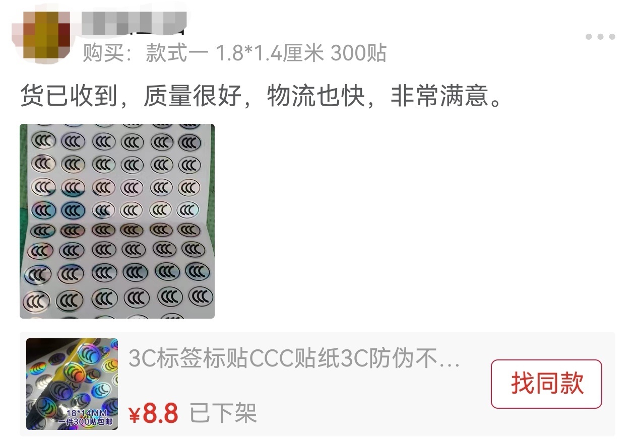 不過,這卻變成了一些人眼中的“商機(jī)”。中國(guó)新聞網(wǎng)《民生調(diào)查局》記者在部分電商平臺(tái)發(fā)現(xiàn),“3C貼紙”目前仍有售賣,甚至可以隨意定制。