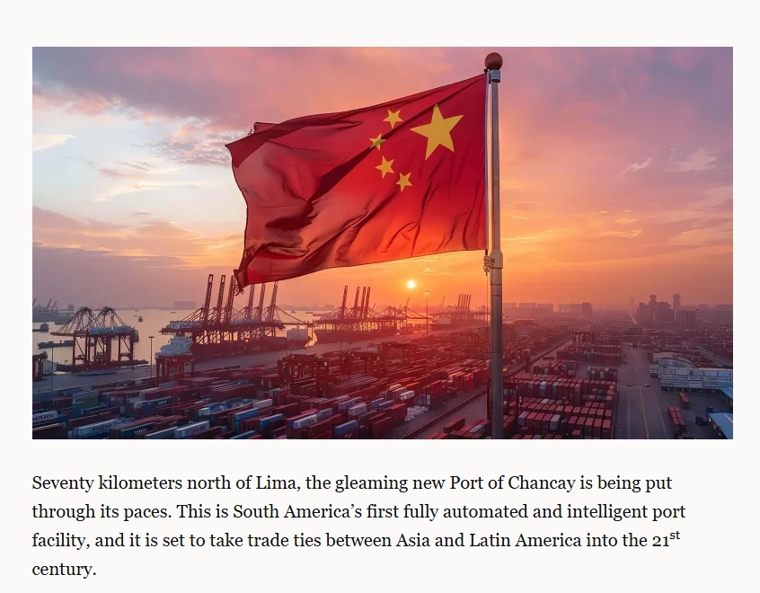 文章首先將目光投向在秘魯首都利馬以北70公里處的錢凱港。這個(gè)由中國和秘魯合作建設(shè)的嶄新港口,是南美洲首個(gè)全自動(dòng)智能化港口設(shè)施,它將把亞洲與拉丁美洲的貿(mào)易關(guān)系帶入21世紀(jì)。隨著通往該港口的跨大陸公路和鐵路連接完工,錢凱港不僅要處理涉及南美洲太平洋沿岸的進(jìn)出口貨物,也將處理從阿根廷、巴西和巴拉圭穿越太平洋運(yùn)往中國的牛肉、大豆和小麥等貨物。