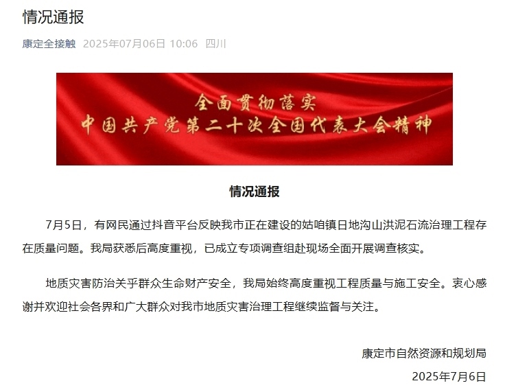 中新網(wǎng)7月6日電 據(jù)“康定全接觸”微信公眾號(hào)消息,7月5日,有網(wǎng)民通過(guò)抖音平臺(tái)反映四川省康定市正在建設(shè)的姑咱鎮(zhèn)日地溝山洪泥石流治理工程存在質(zhì)量問(wèn)題??刀ㄊ凶匀毁Y源和規(guī)劃局獲悉后高度重視,已成立專(zhuān)項(xiàng)調(diào)查組赴現(xiàn)場(chǎng)全面開(kāi)展調(diào)查核實(shí)。