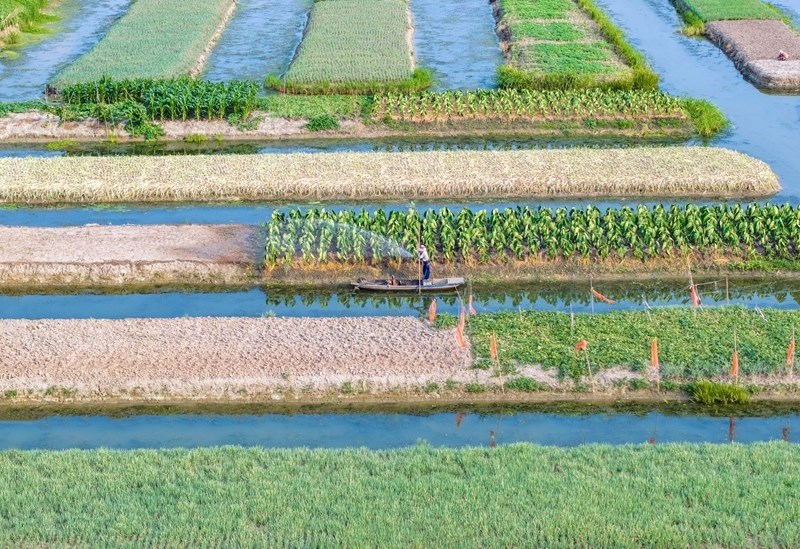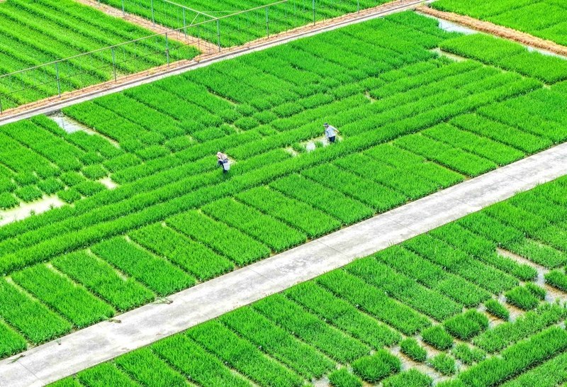 7月7日,在江蘇里下河地區(qū)農科所(揚州市農科院),農民在試驗田勞作(無人機照片)。