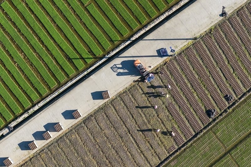 7月7日,浙江省余姚市黃家埠鎮(zhèn)上塘村農民在田間擺放晚稻秧盤(無人機照片)。