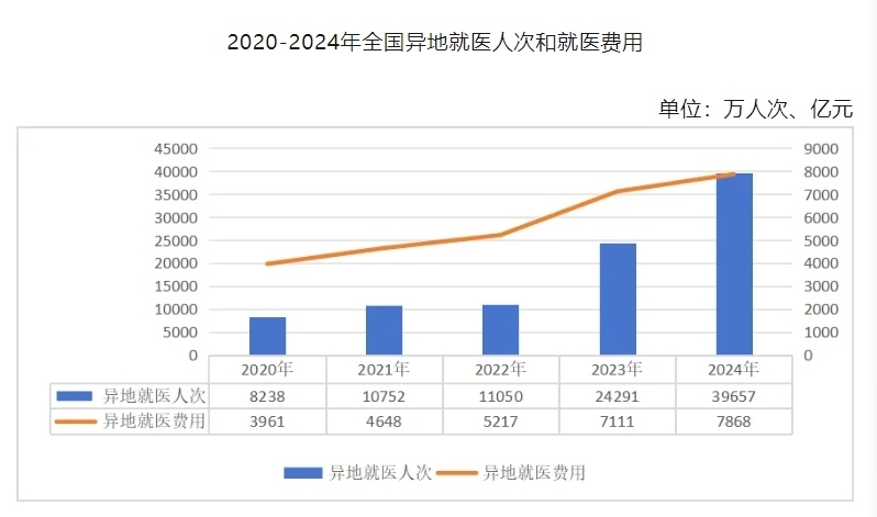 數(shù)據(jù)顯示,2020年至2024年間,全國(guó)異地就醫(yī)人次和就醫(yī)費(fèi)用呈增長(zhǎng)態(tài)勢(shì)。