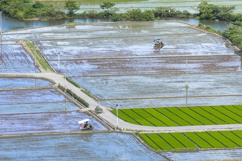 7月21日,浙江省余姚市黃家埠鎮(zhèn)上塘村農(nóng)民在田間駕駛插秧機插種晚稻(無人機照片)。