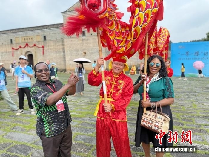 中新網(wǎng)7月21日電(記者 黃方) 鼓聲“咚咚咚”在江西贛州龍南市關(guān)西新圍響起,非洲記者大會(huì)秘書長(zhǎng)威廉·奧洛首次嘗試舞龍。他興奮地?fù)u動(dòng)著龍頭,跟隨節(jié)奏躍動(dòng),忍不住連聲贊嘆:“這太有節(jié)奏感了!”