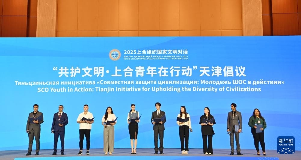 7月23日在2025上合組織國家文明對話現(xiàn)場拍攝的“共護文明·上合青年在行動”天津倡議發(fā)布環(huán)節(jié)。新華社記者 李然 攝