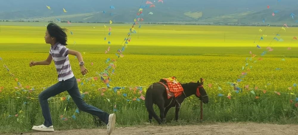 7月22日,抓拍到小游客在門源百里油菜花旁奔跑。新華社記者 古一平 攝