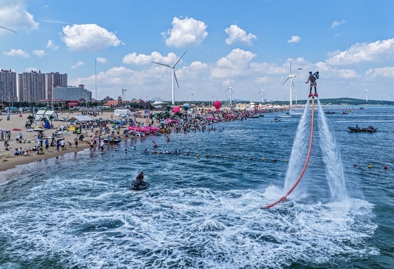 7月24日,游客在山東省榮成市那香海國際旅游度假區(qū)體驗?zāi)ν型Вo人機照片)。