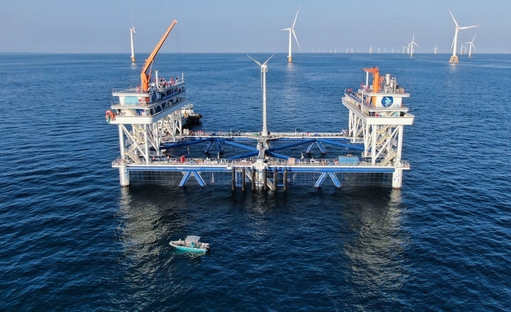 這是在廣東汕尾拍攝的中廣核“伏羲一號”風(fēng)漁融合網(wǎng)箱平臺(2024年9月2日攝,無人機照片)。新華社記者 鄧華 攝