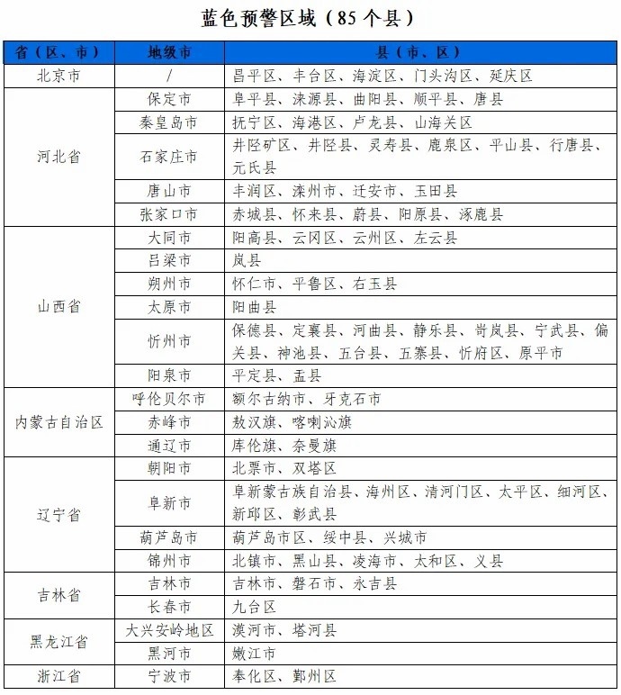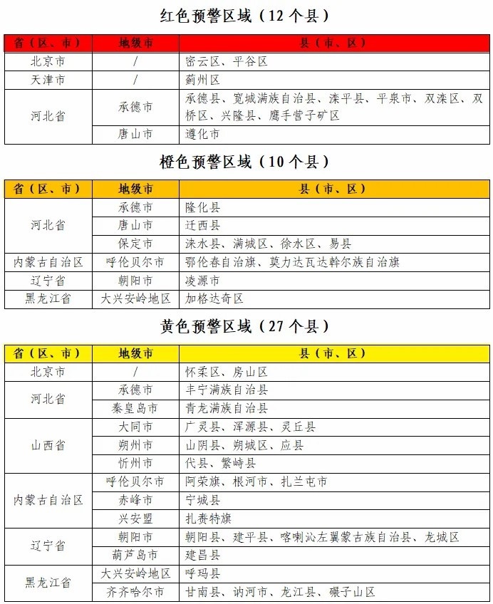 據(jù)“中國水利”微信公眾號消息,水利部和中國氣象局7月28日18時聯(lián)合發(fā)布紅色山洪災(zāi)害氣象預(yù)警:預(yù)計(jì),7月28日20時至7月29日20時,北京東部、天津北部、河北中部和東北部、內(nèi)蒙古東北部、遼寧西部、黑龍江西部等地部分地區(qū)發(fā)生山洪災(zāi)害可能性大(橙色預(yù)警),其中,北京東部、天津北部、河北東北部局地發(fā)生山洪災(zāi)害可能性很大(紅色預(yù)警),預(yù)警區(qū)域涉及的縣(市、區(qū))見下表。其他地區(qū)也可能因局地短歷時強(qiáng)降水引發(fā)山洪災(zāi)害,請各地注意做好實(shí)時監(jiān)測、防汛預(yù)警和轉(zhuǎn)移避險等防范工作。