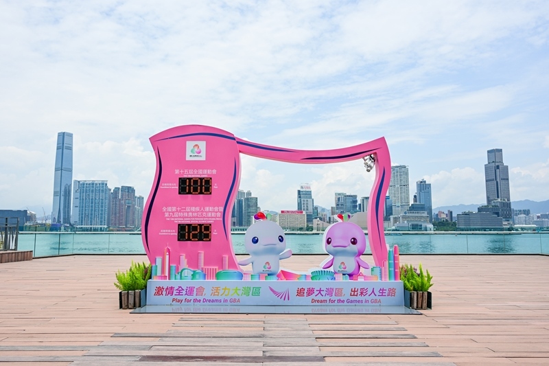 這是8月1日拍攝的香港維港沿岸的第十五屆全國運動會倒計時牌。