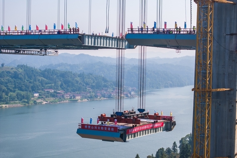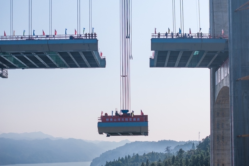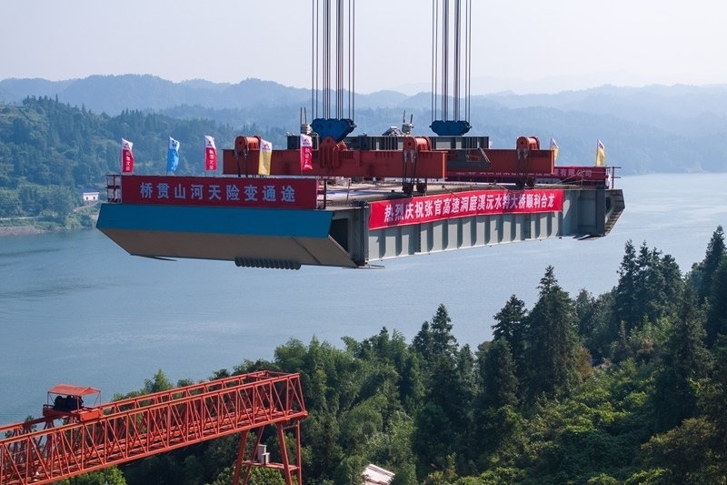 8月3日,在張官高速洞庭溪沅水特大橋施工現(xiàn)場(chǎng),一塊鋼混結(jié)合梁在被緩緩提升(無(wú)人機(jī)照片)。