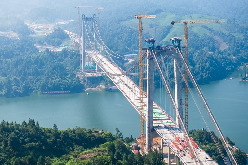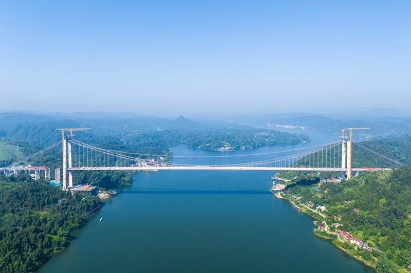 這是8月3日在懷化市沅陵縣拍攝的施工中的張官高速洞庭溪沅水特大橋(無(wú)人機(jī)照片)。