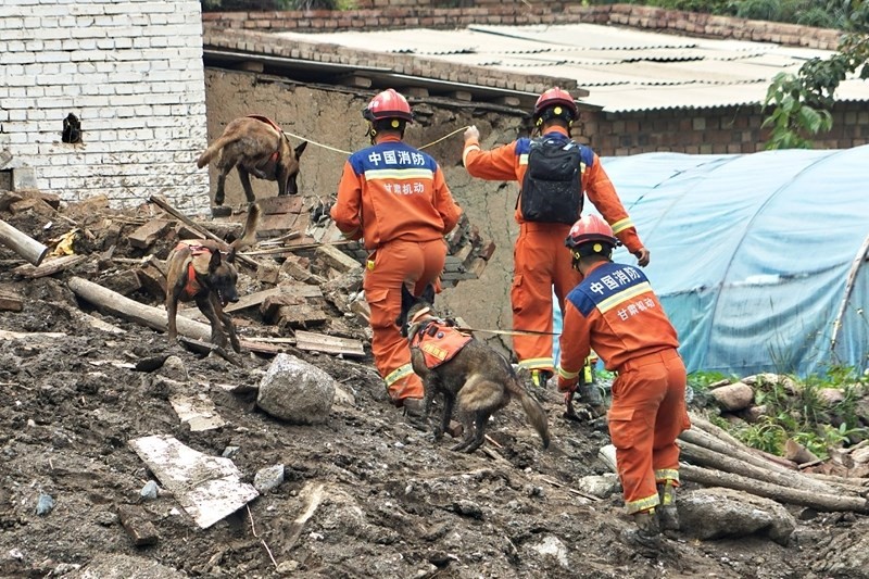 8月9日,甘肅省森林消防總隊消防員在榆中縣馬坡鄉(xiāng)舊莊溝村利用搜救犬搜救。