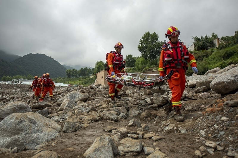 8月9日,國家西北區(qū)域應(yīng)急救援中心指戰(zhàn)員在馬坡鄉(xiāng)舊莊溝村攜帶救援擔架沿河道搜救失聯(lián)人員。