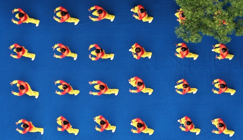 8月8日,在江蘇省揚(yáng)州市宋夾城體育休閑公園,健身愛(ài)好者練習(xí)太極拳(無(wú)人機(jī)照片)。