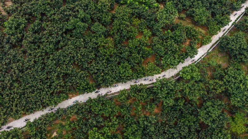 8月8日,騎行愛(ài)好者在河北省遵化市蘇家洼鎮(zhèn)二道嶺村騎行(無(wú)人機(jī)照片)。