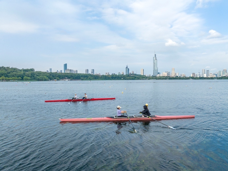 8月8日,市民在江蘇省南京市玄武湖公園劃艇(無(wú)人機(jī)照片)。