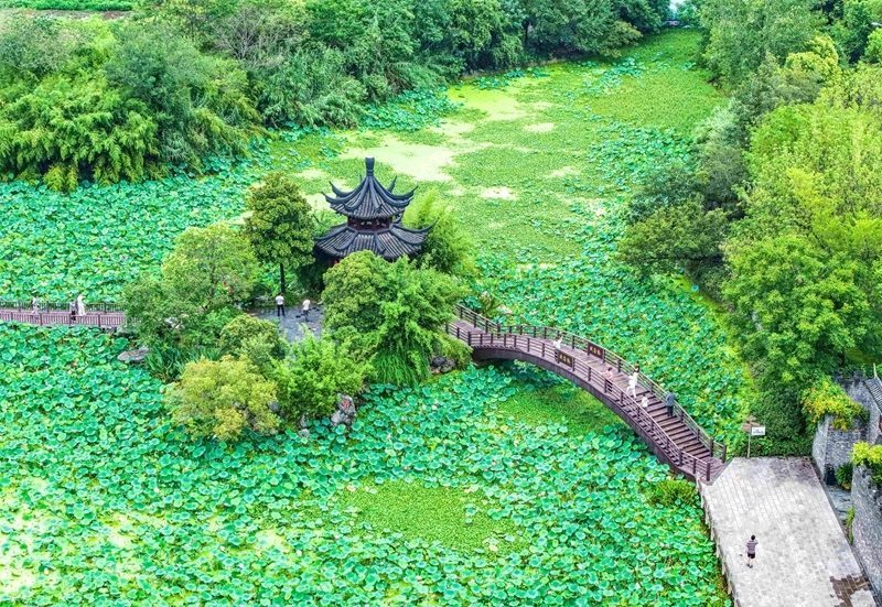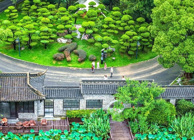 8月10日,游客在江蘇省揚州市江都區(qū)丁伙鎮(zhèn)樸園游玩(無人機(jī)照片)。