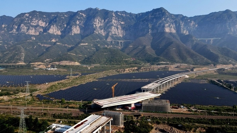 這是8月11日拍攝的河南省濟(jì)源市沿太行山高速公路跨焦柳鐵路立交橋轉(zhuǎn)體施工現(xiàn)場(無人機(jī)照片)。