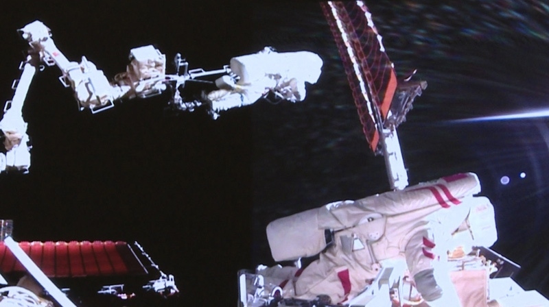 這是8月15日在北京航天飛行控制中心屏幕上拍攝的神舟二十號乘組航天員陳冬(左)與王杰在艙外工作的畫面(視頻截圖)。新華社記者 殷家捷 攝