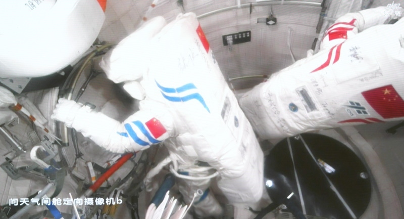 這是8月15日在北京航天飛行控制中心屏幕上拍攝的神舟二十號乘組航天員陳冬(左)與王杰準(zhǔn)備出艙的畫面。新華社記者 厲彥辰 攝