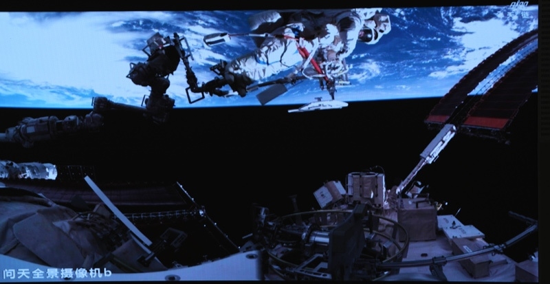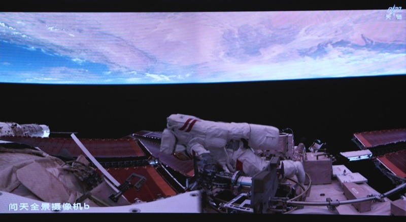 這是8月15日在北京航天飛行控制中心屏幕上拍攝的神舟二十號乘組航天員陳冬在艙外工作的畫面。新華社記者 厲彥辰 攝