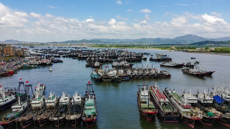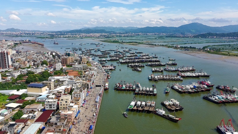 8月16日,停泊在博賀漁港的漁船等待開漁(無(wú)人機(jī)照片)。