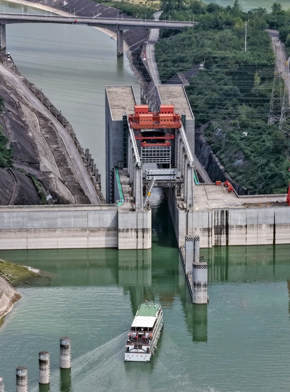 8月16日,在湖北省宜昌市,下行游船長江三峽5號通過三峽升船機(無人機照片)。