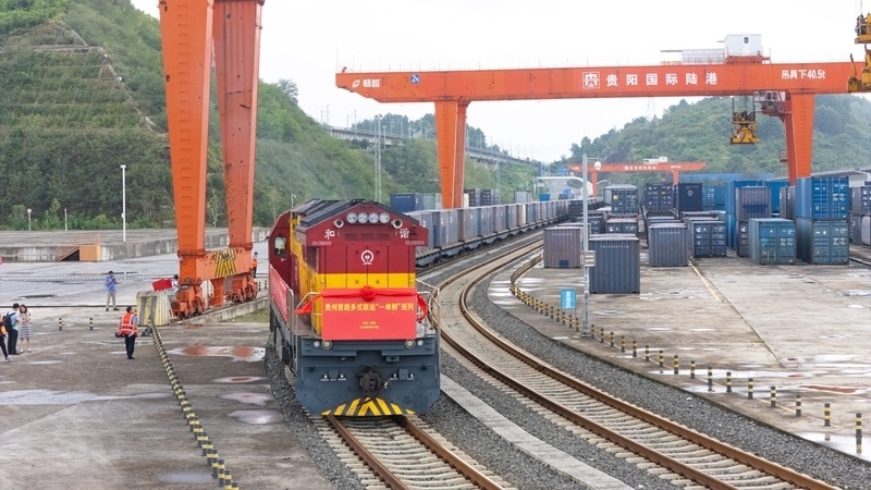 8月19日,貴州首趟多式聯(lián)運“一單制”班列駛出貴陽國際陸港都拉營站(無人機照片)。