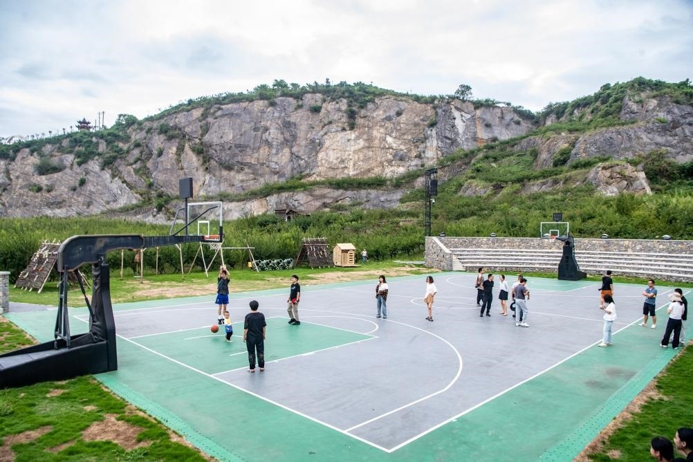 8月16日,在重慶市北碚區(qū)靜觀鎮(zhèn)中華村,游客在礦坑修復(fù)改造的運(yùn)動(dòng)場(chǎng)內(nèi)打球。新華社記者 唐奕 攝