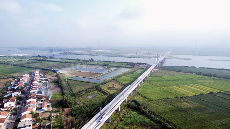 8月23日,試驗(yàn)列車通過襄荊高鐵宜城漢江特大橋(無人機(jī)照片)。