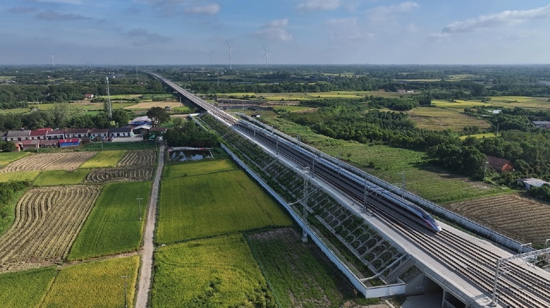 8月23日,試驗(yàn)列車從荊門市沙洋西站折返,駛向襄陽東站(無人機(jī)照片)。