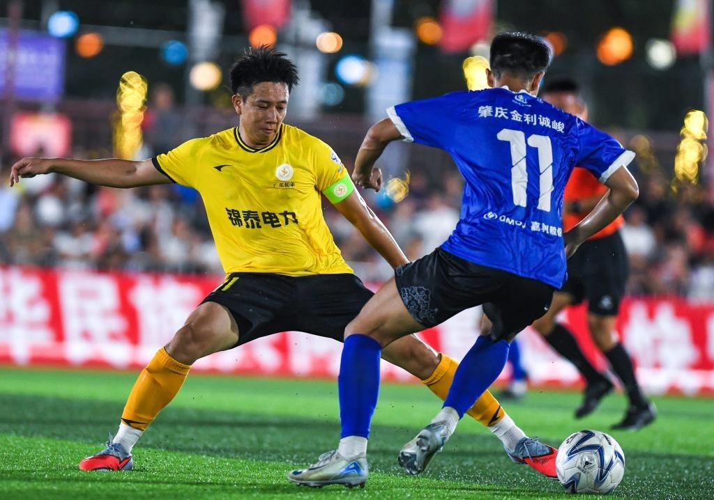 8月23日,廣東和平商會足球隊球員陳宇(左)與廣東肇慶金利誠峻足球隊球員陳開樂在比賽中。新華社記者 楊文斌 攝