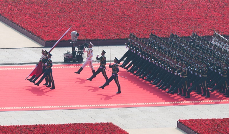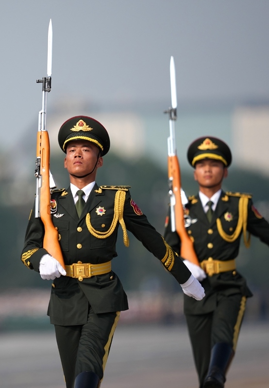 9月3日,紀(jì)念中國人民抗日戰(zhàn)爭暨世界反法西斯戰(zhàn)爭勝利80周年大會在北京隆重舉行。這是走向旗桿基座的國旗護(hù)衛(wèi)隊。