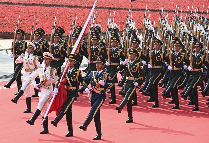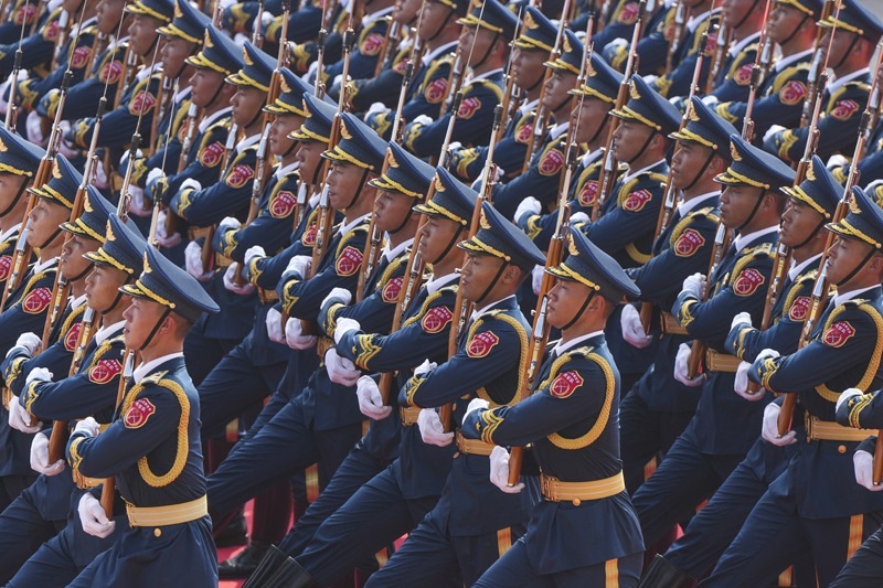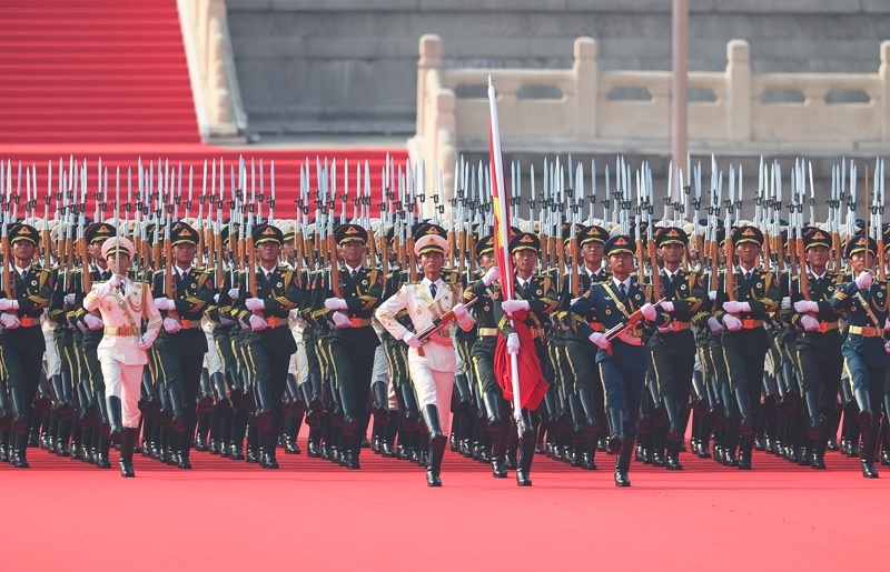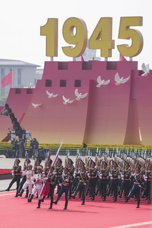 9月3日,紀(jì)念中國(guó)人民抗日戰(zhàn)爭(zhēng)暨世界反法西斯戰(zhàn)爭(zhēng)勝利80周年大會(huì)在北京隆重舉行。這是國(guó)旗護(hù)衛(wèi)隊(duì)在行進(jìn)中。