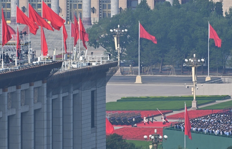 9月3日,紀(jì)念中國(guó)人民抗日戰(zhàn)爭(zhēng)暨世界反法西斯戰(zhàn)爭(zhēng)勝利80周年大會(huì)在北京隆重舉行。這是國(guó)旗護(hù)衛(wèi)隊(duì)從人民英雄紀(jì)念碑基座出發(fā),走向旗桿基座。