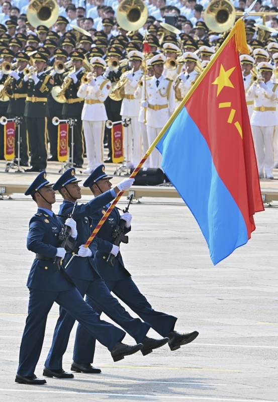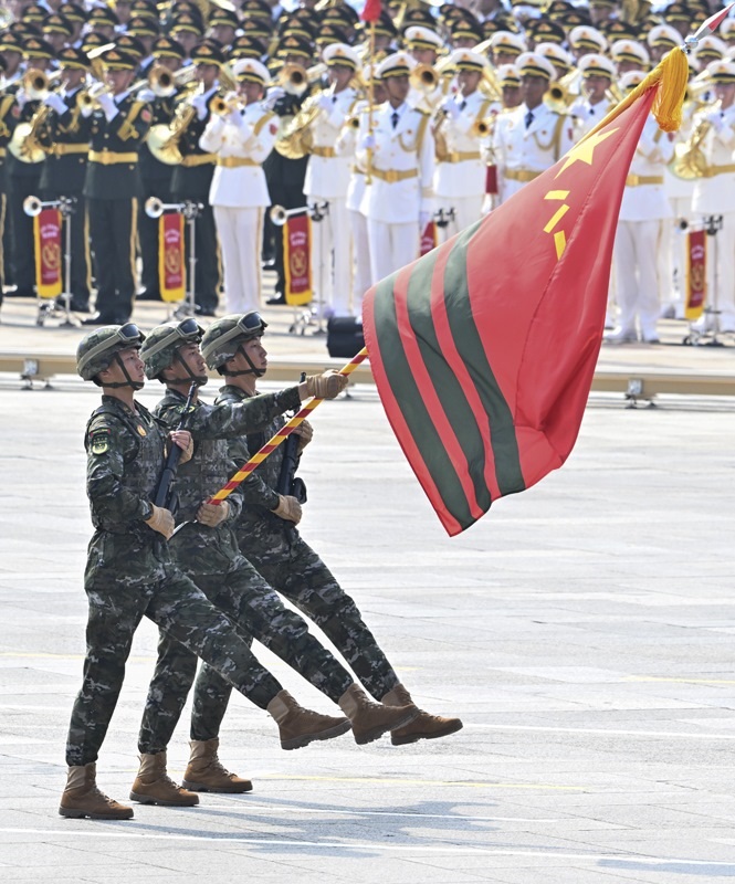 9月3日,紀(jì)念中國人民抗日戰(zhàn)爭暨世界反法西斯戰(zhàn)爭勝利80周年大會(huì)在北京隆重舉行。這是戰(zhàn)旗方隊(duì)接受檢閱。