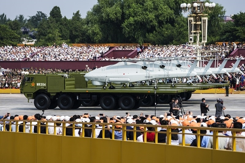 9月3日,紀(jì)念中國人民抗日戰(zhàn)爭暨世界反法西斯戰(zhàn)爭勝利80周年大會在北京隆重舉行。這是空中無人作戰(zhàn)方隊(duì)接受檢閱。