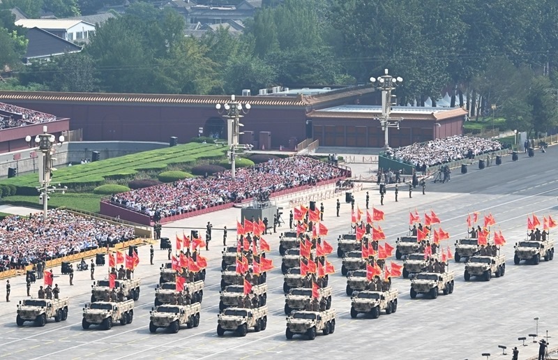 9月3日,紀(jì)念中國人民抗日戰(zhàn)爭暨世界反法西斯戰(zhàn)爭勝利80周年大會在北京隆重舉行。這是信息支援方隊(duì)接受檢閱。