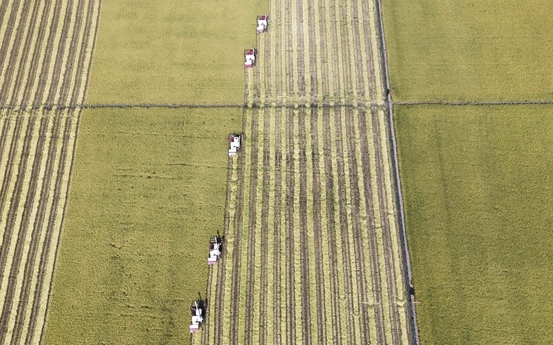 9月5日,在北大荒集團(tuán)黑龍江江川農(nóng)場(chǎng)有限公司水稻種植基地,農(nóng)機(jī)手操作農(nóng)機(jī)收割水稻(無人機(jī)照片)。