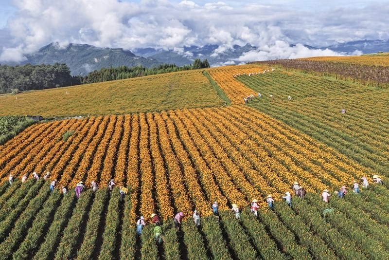 9月5日,農(nóng)民在云南騰沖市明光鎮(zhèn)鳳凰村鳳凰山采收萬壽菊(無人機(jī)照片)。