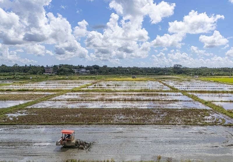 9月4日,海南省瓊海市農(nóng)機(jī)手在龍壽洋田野公園耕作(無人機(jī)照片)。