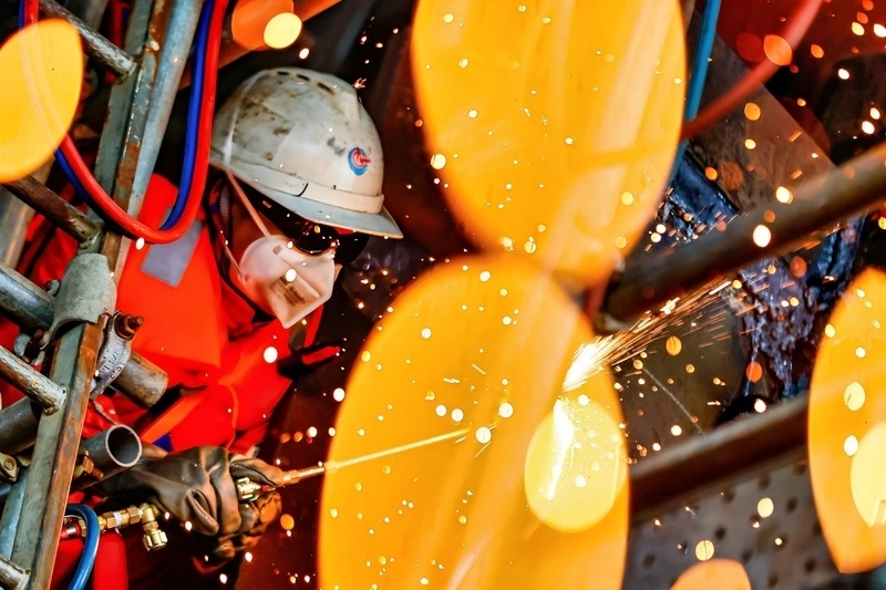 9月8日,工人在墾利6-1油田10-1北區(qū)塊Ⅱ期開(kāi)發(fā)項(xiàng)目油氣平臺(tái)安裝作業(yè)現(xiàn)場(chǎng)進(jìn)行切割作業(yè)。