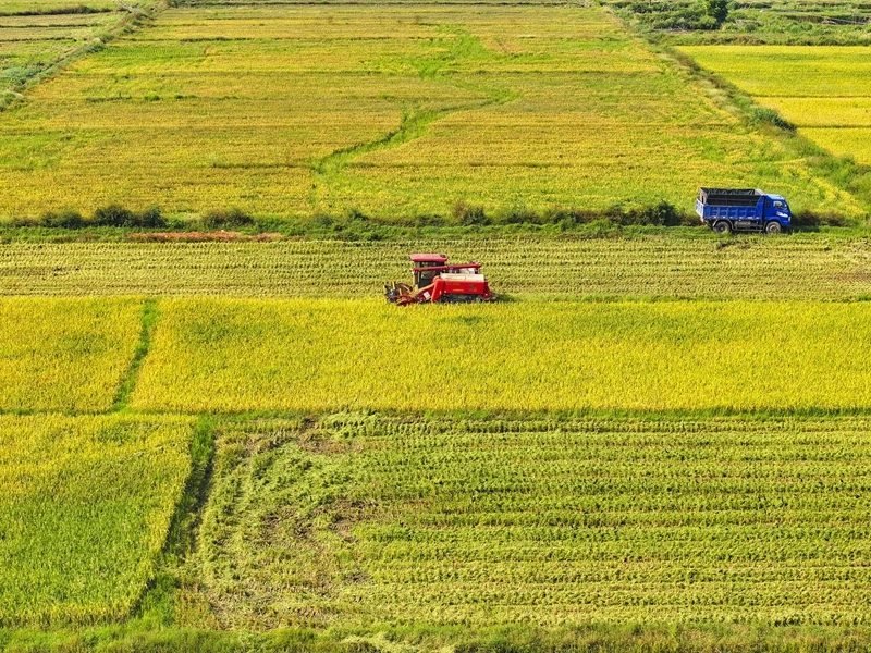 10月11日,湖南省衡陽(yáng)市衡山縣白果鎮(zhèn)村民駕駛農(nóng)機(jī)收割稻谷(無人機(jī)照片)。
