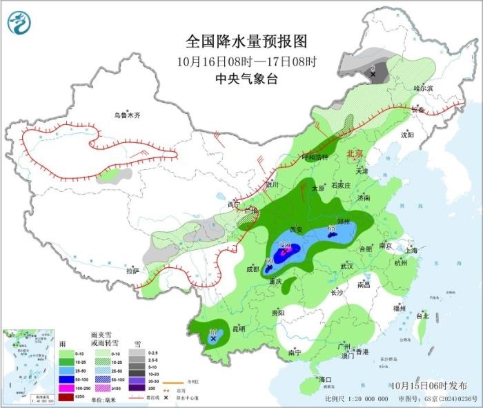 10月16日08時至17日08時,內蒙古東部、黑龍江西部、吉林西部、甘肅西南部、青海東部和南部、西藏東北部等地部分地區(qū)有小到中雪或雨夾雪,內蒙古東北部等地部分地區(qū)有大雪;四川盆地東部、西北地區(qū)東部、黃淮西部、江漢西部和北部、云南西南部等地部分地區(qū)有中到大雨,其中,陜西南部、四川東北部、重慶西北部、河南西南部等地部分地區(qū)有暴雨或大暴雨(100~120毫米)。新疆南疆盆地、內蒙古中西部、西北地區(qū)東部等地部分地區(qū)有4~6級風。