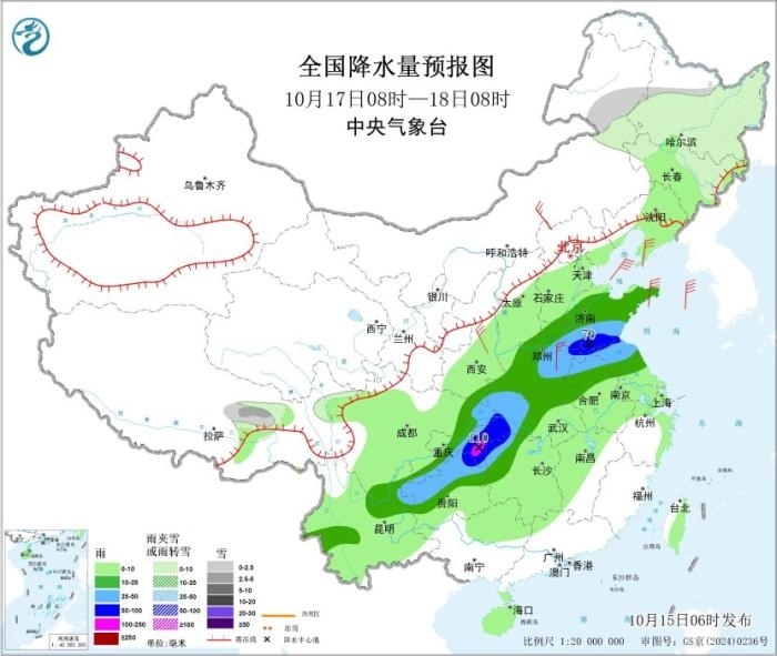 10月17日08時至18日08時,東北地區(qū)中北部、內蒙古東北部、西藏東北部等地的部分地區(qū)有小到中雪或雨夾雪;華北南部、黃淮、江淮北部、湖北、重慶、貴州中北部、湖南西北部、云南東北部和西南部等地部分地區(qū)有中到大雨,其中,山東南部、河南東部、安徽北部、江蘇北部、湖北西南部、湖南西北部、重慶東部、貴州東北部等地部分地區(qū)有暴雨或大暴雨(100~110毫米)。內蒙古中東部、華北北部和東部、黃淮、江淮等地部分地區(qū)有4~6級風。