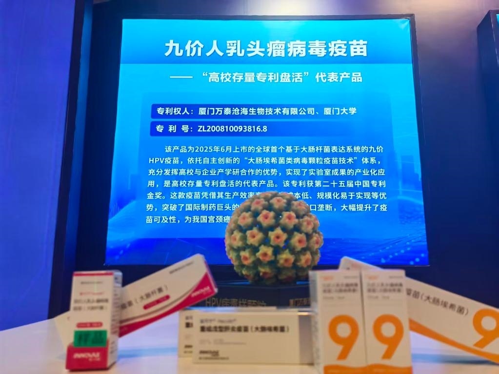 在第十四屆中國國際專利技術(shù)與產(chǎn)品交易會上展出的九價人乳頭瘤病毒疫苗。新華社記者徐鵬航 攝